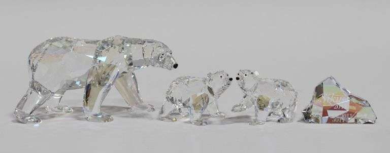 A polar bear 'Siku' and two cubs, made from irridescent crystal with black eyes and nose. The mother 'Siku' is packaged with a crystal plaque shaped like an iceberg, engraved “Siku 2011” and “AH” (the initials of the designer). Item #1053154, retired 2011. The two matching polar bear cubs packaged together in one box. Item #1079156. All are in original boxes.