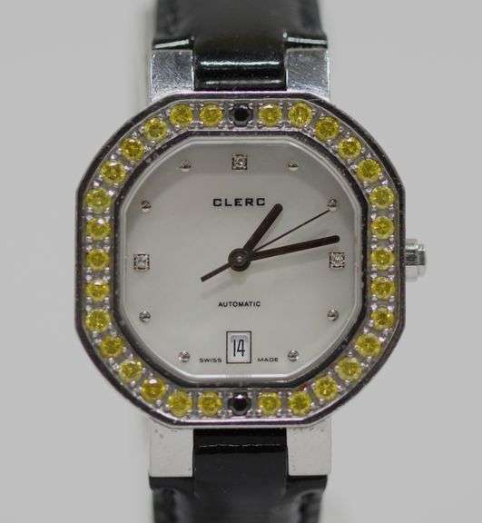 One ladies Swiss made Clerc automatic wristwatch. Stainless steel case, diamond set bezel. Mother of pearl dial with diamond set markers and silvertone hands. Date display at 6 o'clock. Sapphire crystal face and skeleton back. Model #9806-Y. The watch is set with: