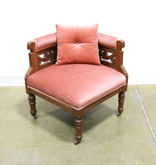 Wooden carved chair with upholstered seat and back rest. Includes a matching throw cushion. On caster feet.