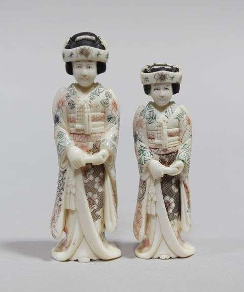 Two intricately carved ivory netsuke depicting two ladies in traditional dress. With incised detail and signature to the underside.
