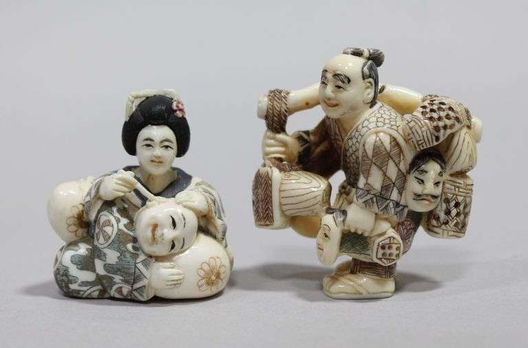 Two intricately carved ivory netsuke depicting a mask merchant and a lady with a child in her lap. With incised detail and signature to the underside.