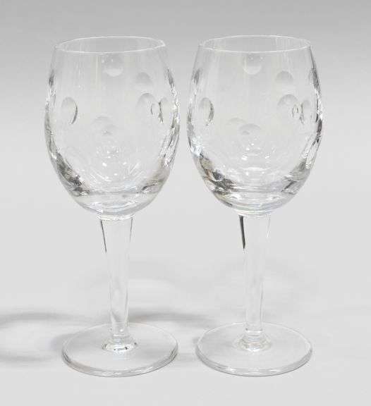A pair of heavy cut crystal wine glasses. Both with etched logo mark.