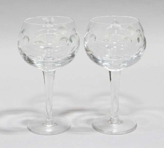 A pair of heavy cut crystal wine glasses. Both with etched logo mark.