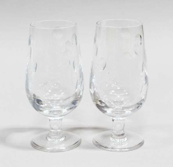 A pair of heavy cut crystal stemmed water goblets. Both with etched logo mark. Includes original box.
