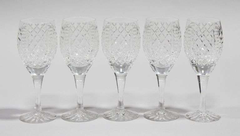 A set of five heavy cut crystal sherry glasses. Four with etched logo mark and one unmarked.
