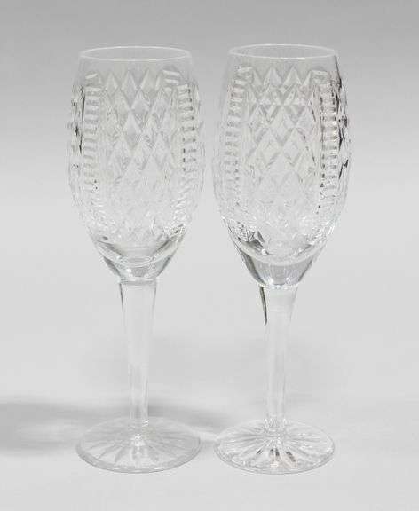 A pair of heavy cut crystal champagne glasses. Both with etched logo mark.