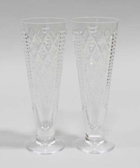 A pair of heavy cut crystal beer glasses. Both with etched logo mark. Includes original box.