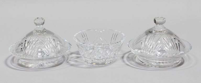 Assembled grouping of heavy cut crystal including two covered butter dishes and a small tapered bowl. All with etched logo mark. Includes one original box.