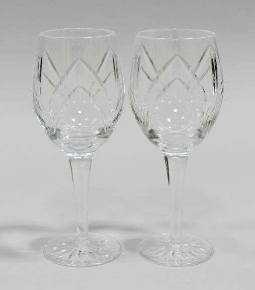 A pair of heavy cut crystal wine glasses. Both with etched logo mark.