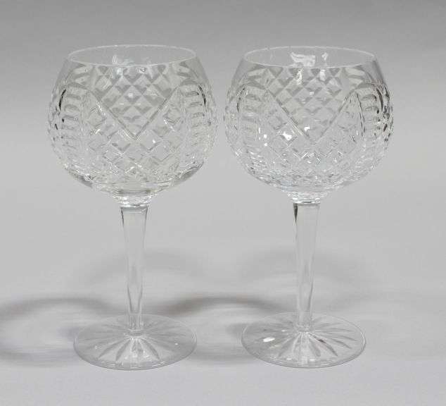 Heavy cut crystal wine glasses, both with blank triangular monogram panel and etched logo mark.