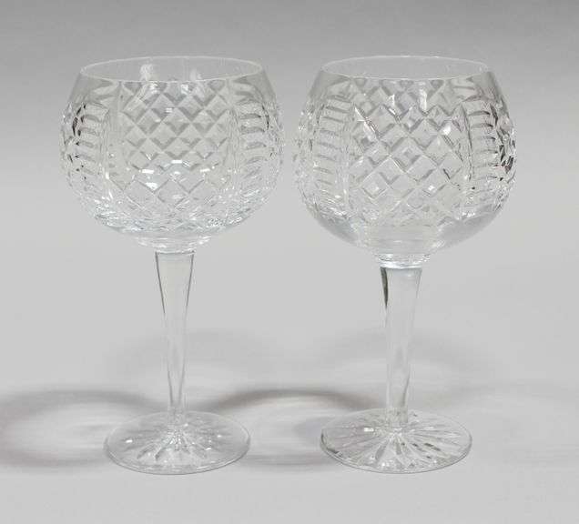 Heavy cut crystal wine glasses, one with a blank rectangular monogram panel and both with etched logo mark.