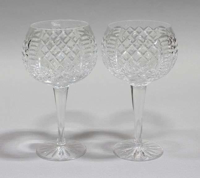 Heavy cut crystal wine glasses, one with etched logo mark, one unmarked. Includes original box.