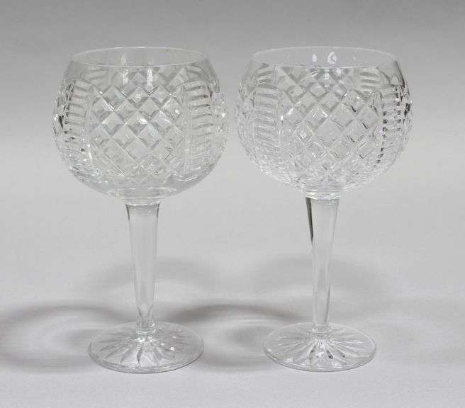 Heavy cut crystal wine glasses, both with etched logo mark. Includes original box.
