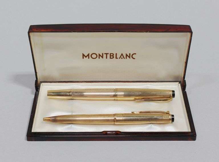 One cased set including a fountain pen and a ballpoint pen set in 14kt yellow gold. Pens are stamped "585". In original case and accompanied by a local gemologist retail replacement certificate.