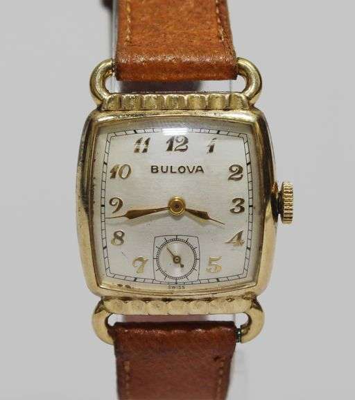 An art deco style 'Director' watch by Bulova, with brown leather band. The movement is a 10BC, has 15J, with an estimated production year of 1944-1951. The bezel is 10K rolled gold plate by Bulova New York. In working condition.