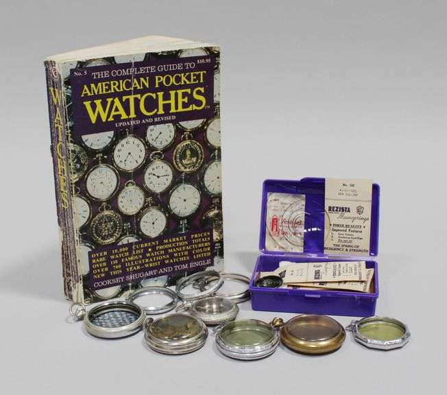 A collection of pocket watch reference and repair materials, including "The complete Guide to American Pocket Watches no.5, 1985, by Cooksey Shugart and Tom Engle", a small box of assorted springs with some original packaging, and assorted empty pocket watch casings including one Empress gold fill by A.W.C.Co.