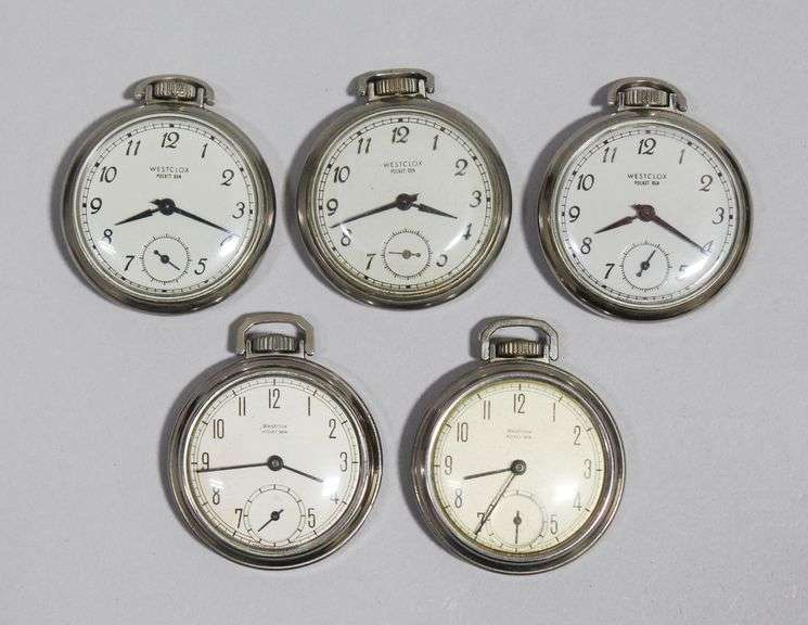 A collection of five Pocket Ben pocket watches by Westclox. All but one marked Westclox or Western Clock Co. to the movement. All with single sunk dials and set in open face white metal casings. All in working condition.