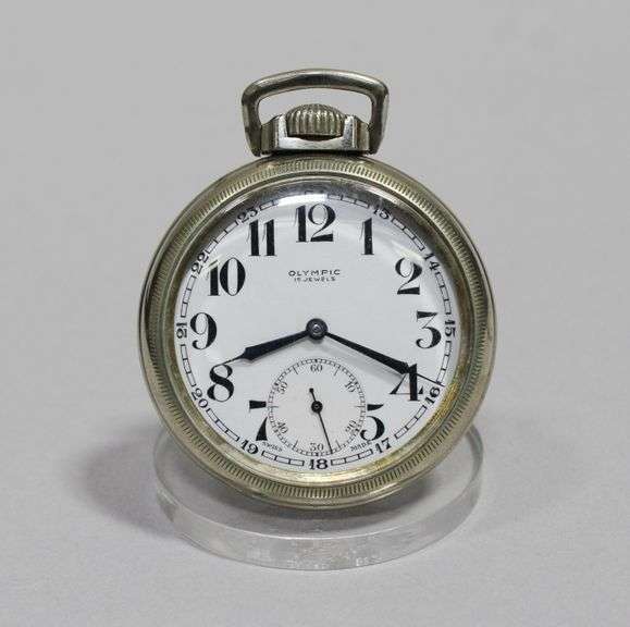 A Swiss pocket watch by Olympic. The movement has 15J, model no. 19A, size 12s, and is marked 1935/12. The watch is set in a patterned open face nickel silver case by A.W.C.Co, with single sunk white enamel dial. In working condition.