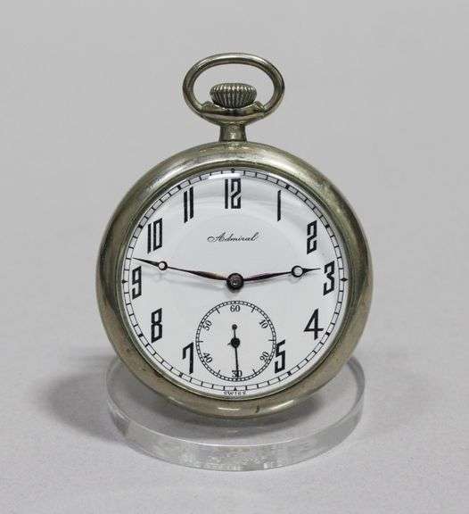 A Swiss Admiral Tavannes Cyma pocket watch produced under the Tacy Watch Co. The movement has 7J, size 12s, with May 1904 patent and an estimated production year of 1916-1922. The watch is set in an open face nickel silver case by A.W.C Co, with double sunk white enamel dial. In working condition.