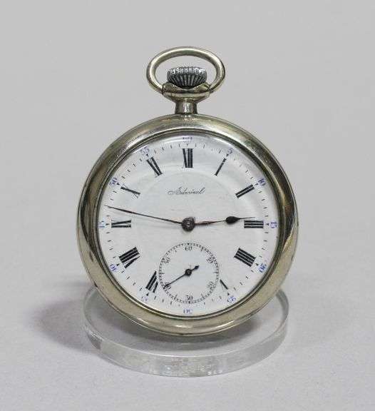 A Swiss Admiral Tavannes Cyma pocket watch produced under the Tacy Watch Co. The movement has 7J, size 12s, with May 1904 patent and an estimated production year of 1916-1922. The watch is set in an open face nickel silver case by A.W.C Co, with double sunk white enamel dial, slight cracking present. In working condition.