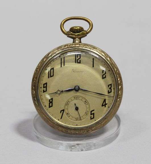 A Swiss pocket watch by Tavannes Watch Co. The movement has 7J, S/N 13266904, size 12s, with May 1904 patent, and an estimated production year of 1921-1922. The watch is set in an engraved open face Derby gold filled case by Montreal Watch Case Co, with single sunk golden metal dial. In working condition.