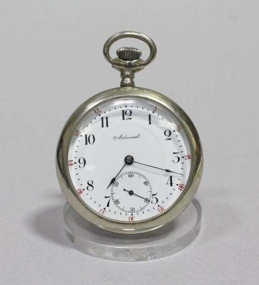 A Swiss Admiral model 999 Tavannes Cyma pocket watch produced under the Tacy Watch Co. The movement has 7J, reference number 999 , size 12s, with an estimated production year of 1916-1922. The watch is set in an open face nickel silver case by A.W.C Co, with double sunk white enamel dial. Repair required.