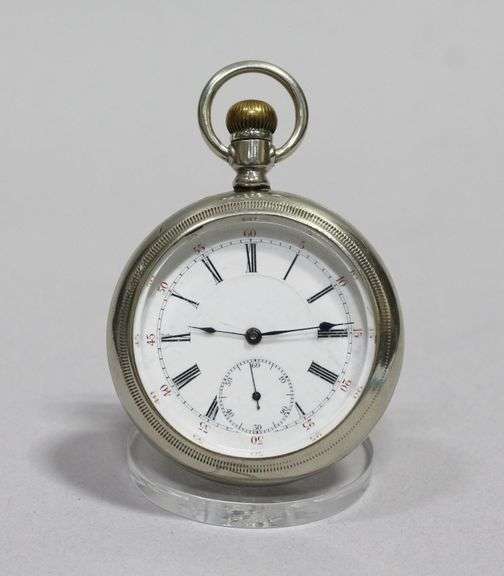 A pocket watch by Eaton Watch Co, Toronto, set with a 17J, 42mm movement, S/N 136141, marked 'The T. Eaton Co Limited'. The watch is set in an open face 'Silveroid' case by A. W. C. Co, with an unmarked double sunk enamel dial. In working condition.