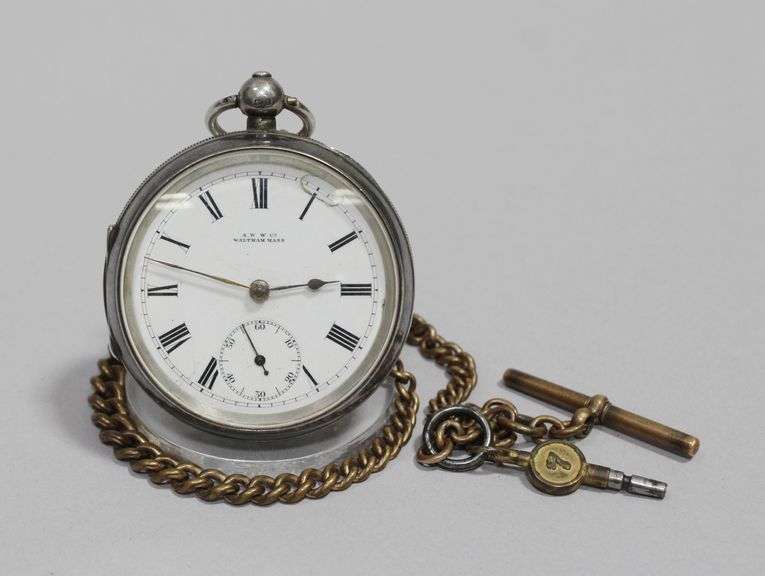A grade Am.W.Co, model 1883 pocket watch by American Waltham Watch Co. The key wind movement has 11J, S/N 5458580, size 18s, with an estimated production year of 1892. The watch is set in an open face sterling silver case, missing outer back plate, with makers mark 'A.L.D.'. Hallmarked, with lion passant and Birmingham anchor, dated to 1912. The piece features a single sunk white enamel dial with some cracking. Attached to a 12in. chain with fob attachment and size 7 winding key. In working condition.
