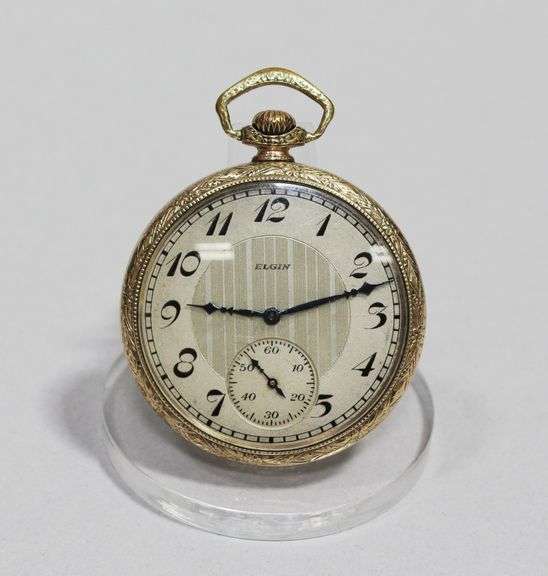 A grade 303, model 3 pocket watch by Elgin National Watch Co. The movement has 7J, S/N 25456234, size 12s, with an estimated production year of 1923. The watch is set in an open face 10K gold filled case by Keystone Watch Case Co, marked 'J. Boss 20 years', with engraved design and landscape to the back plate, and has a double sunk art deco textured metal dial. In working condition.