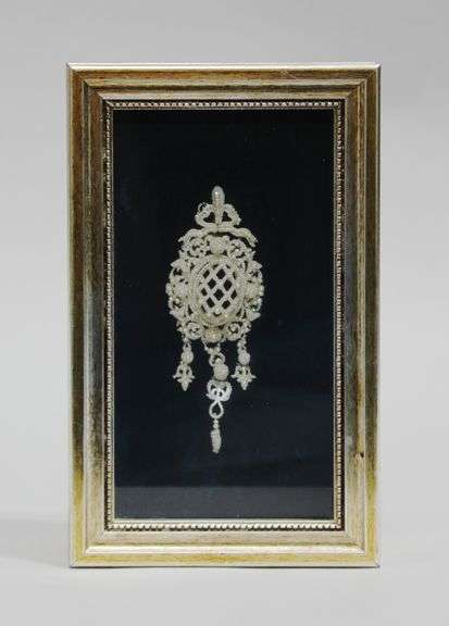 An elaborate seed pearl brooch displayed in a wooden shadowbox frame under glass.