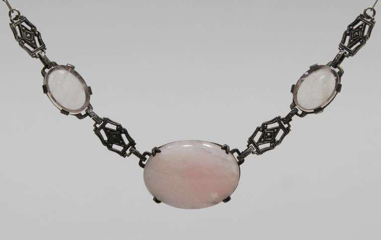 Vintage marked sterling silver marcasite necklace set with three oval pink quartz stones.