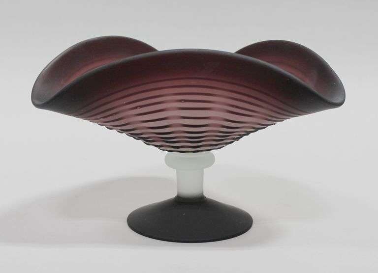 An unsigned handkerchief style pedestal bowl with horizontal lines in dark purple with a frosted black base.