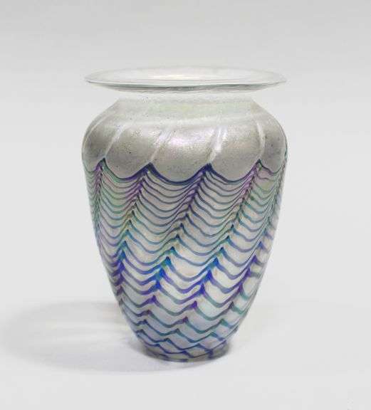 A hand blown baluster form vase with blue iridescent wave design over an opalescent ground. With etched signature to the underside.