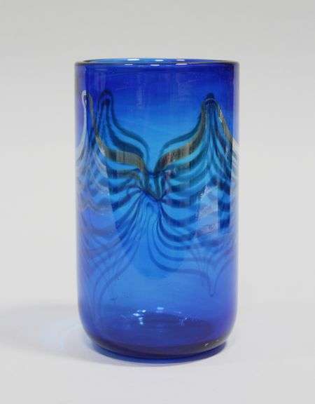 A cylindrical vase with an iridescent pulled feather design over a cobalt blue ground. With etched signature to the underside.