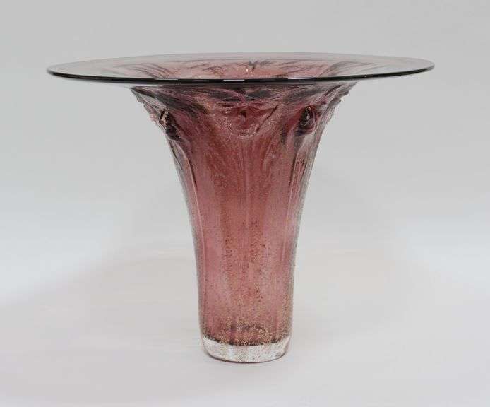 Sand cast and blown cranberry glass vase with wide rim and tapered body. With etched signature to the underside.