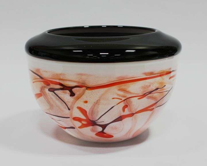 A large art glass centerpiece bowl with a heavy black rim over an orange and brown design. With etched signature to the underside.
