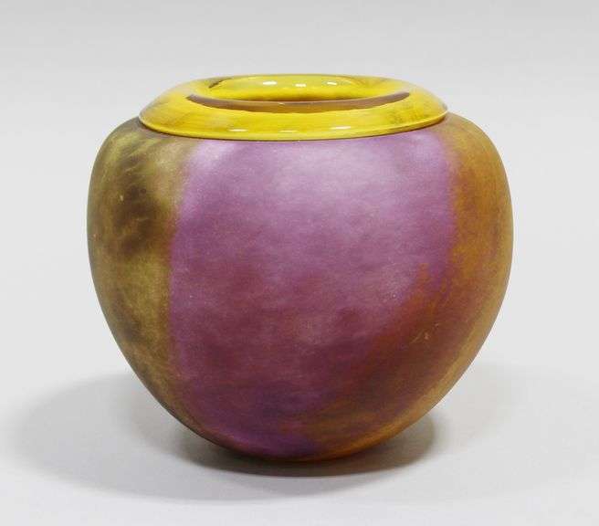 A hand blown round vase by Victoria, BC glass blower Lisa Samphire. Frosted glass in yellow, purple, and green and with a yellow glass rim under clear glass.