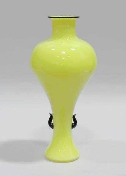 Blown and flameworked yellow art glass vase with fused black "ears". From the Deco Series. With etched signature to the underside.