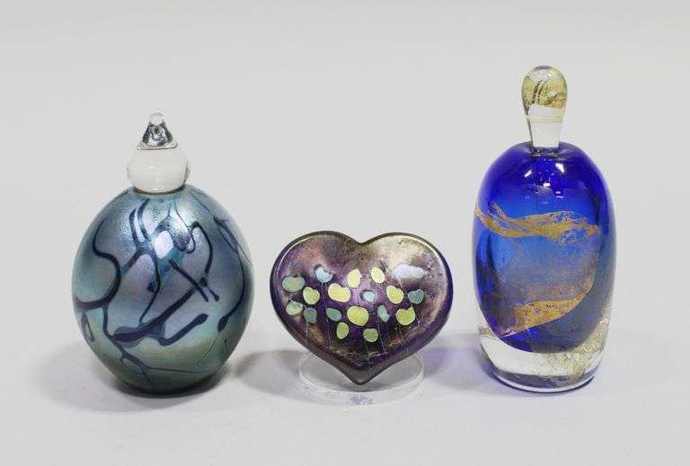 Assembled grouping of art glass including an unsigned Robert Held style heart paperweight, a Matthew Buechner blue glass scent bottle with stopper and a Robert Eickholt blue iridescent scent bottle (the stopper with an imperfection).