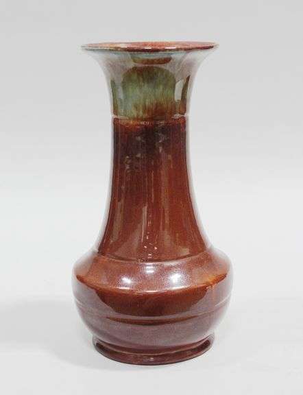 Medalta baluster vase in two-tone mottled brown glaze with flared rim. The base is impressed 'No. 1200, 12' and is stamped 'Medalta Potteries Medicine Hat'. The vase has a cracked chip to the rim.