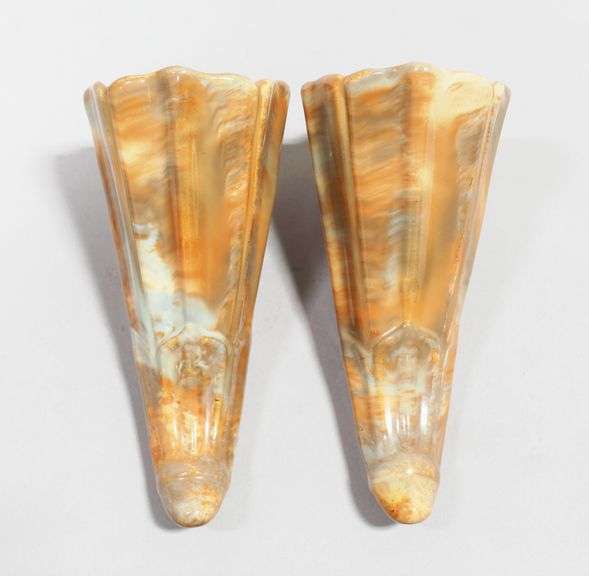 Horn shaped Cornucopia Medalta Potteries wall sconces with mottled glaze. The base of the sconce is stamped ‘Medalta Potteries Medicine Hat.’