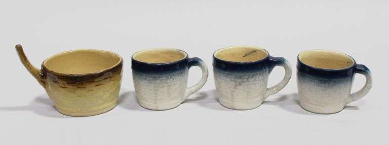 Three Medalta mugs and a handle bowl with a basket weave pattern. The mugs feature a blue and white gradient and show signs of crazing. The bowl features a yellow and brown gradient with an up turned handle. All pieces are stamped with ‘Medalta Potteries Redcliff’ to the base.