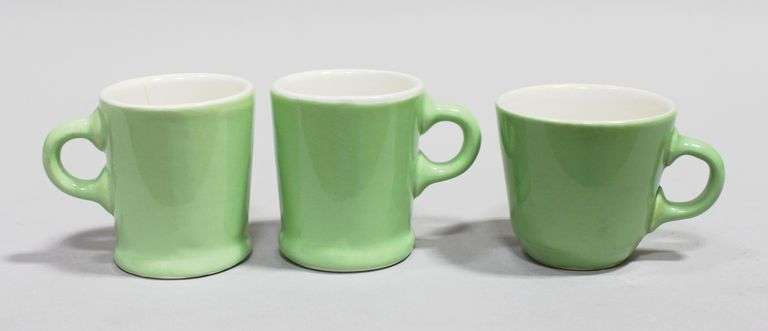 Light green stoneware mugs. Two of the mugs are unmarked and have signs of crazing, one has a hairline crack to the inside. The other mug impressed 'M-3' to the underside.