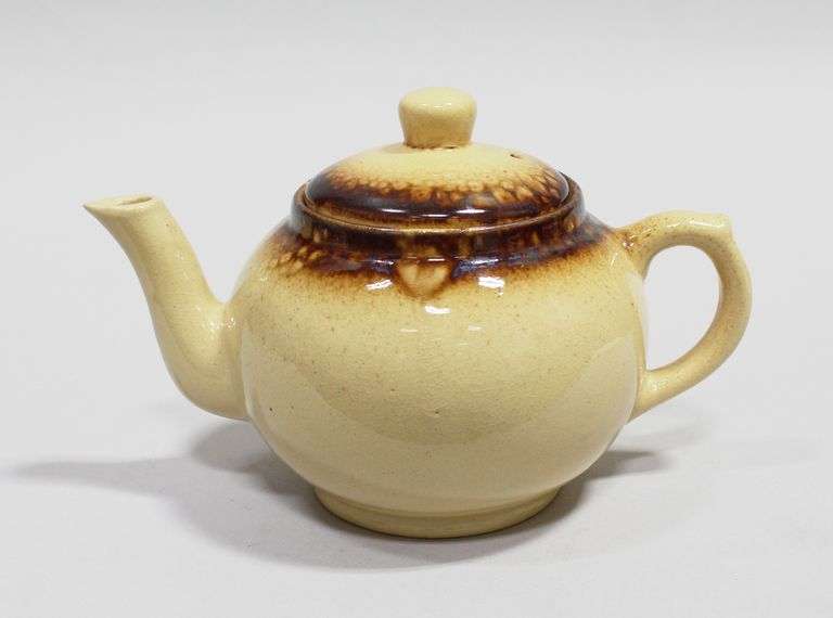 Cream yellow with fire rimmed Medalta teapot. The teapot is stamped ‘Medalta Redcliff’ to the base and shows signs of crazing.