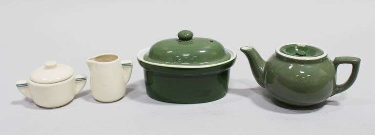 Green and white Medalta collection. The collection includes green twin striped covered sugar bowl and creamer, as well as an oval covered bake ware and mini teapot. The teapot has a chip to the lid. The Bake ware and teapot are stamped 'Medalta Potteries'; the twin striped items are stamped with the recent 'Medalta' logo