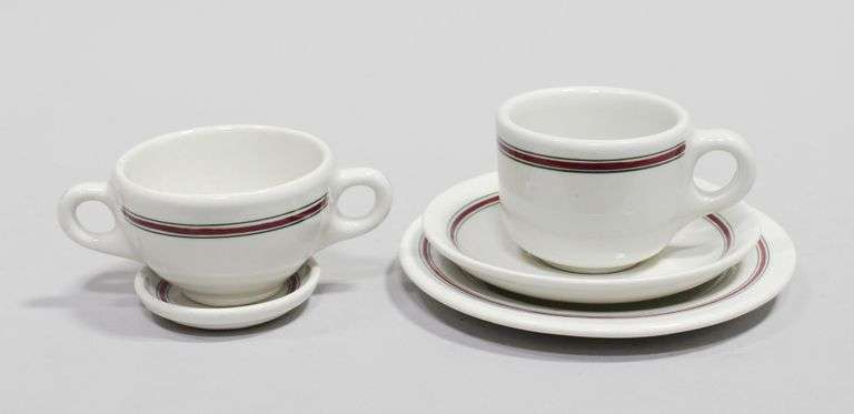 Red patterned Medalta collection including miniature 3 in. plate, cup and saucer, double handled sugar bowl, and 7.5 in. dessert plate. The dessert plate has a small chip. The collection is stamped 'Medalta' to the undersides.