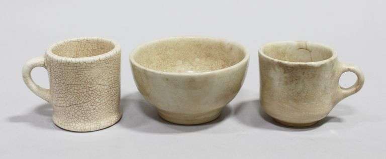 Late 1930’s Medalta hotel ware. A bowl and two mugs the pieces show signs of staining and crazing. The items are stamped ‘Medalta Made in Canada’ on the underside.