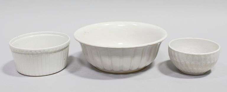 White fluted and scalloped bowl collection. Two of the bowls have been marked with the Sunburst logo and one is stamped 'Medalta Potteries'. The medium sized fluted bowl has a small chip to one wall.