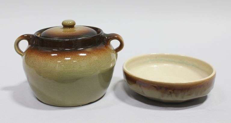 Olive brown gradient Medalta stoneware bean pot and cereal bowl. The pot has a 4 in. diameter lid with a small crack and crazing to the underside. The pot is stamped 'Medalta' on the underside. The pot has a general crazing to the green section. The pot is accompanied by a cereal bow in similar colors, stamped 'Medalta' to the base.