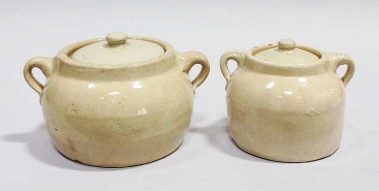 Two glazed stoneware pots with lids and double small loop handles. One 2 quart bean pot with 5 in. diam. lid, stamped 'Medalta' with impressed '2' to the base. And one Medalta pot with 3.5 in. lid, stamped 'Medalta' to the base. Both pots have crazing around the rim and handles.